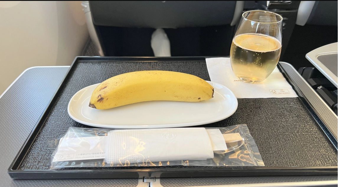 “Frokost var spaghetti, der ikke smagte godt. Mine måltider på andre Japan Airlines-flyvninger har også været dårlige, men intet så skuffende som dette. Men det var sødt af kabinepersonalet at give mig spisepinde til bananen,” skriver han videre.