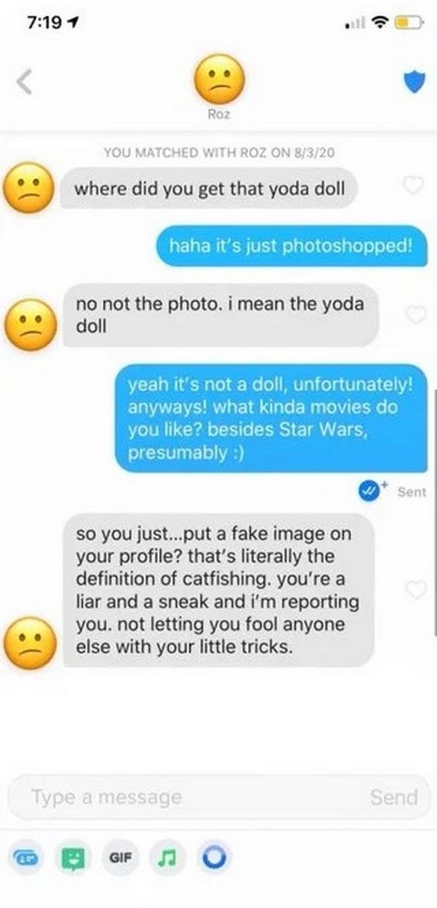 “Så du… putter bare et falsk billede på din profil? Det er bogstaveligt talt definitionen på catfishing. Du er en løgner og lusket, og jeg melder dig. Du skal ikke snyde andre med dine små tricks.”