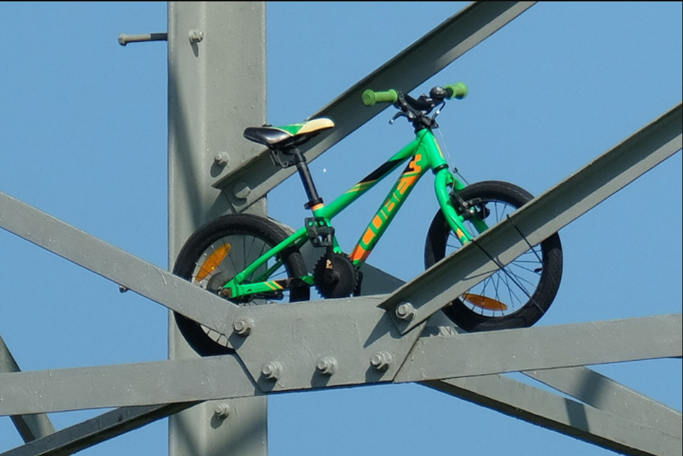 Ukendte personer fæstnede cyklen til krydsstøtten på højspændingsmaster i Feldmarken mellem Bergedorf (Hamborg) og Reinbek (Slesvig-Holsten) i en højde på omkring 30 meter. Køretøjet var sikret med kabelstrips.