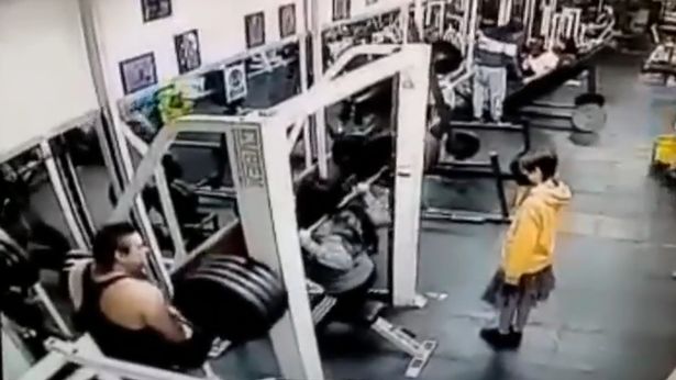 I klippet, der har spredt sig på de sociale medier, ses en mand, der er iført en sort tank-top tilføje yderligere vægt til vægtstangen, inden kvinden placerer sig under den.