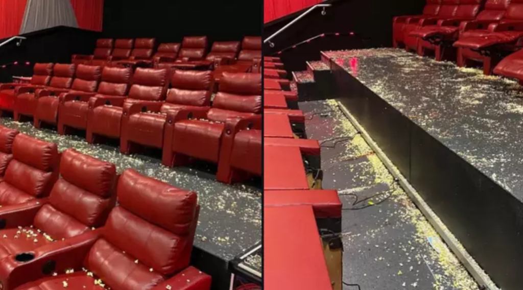 På billederne ses popcorn spredt over gulv og sæder, tomme kopper, slikpapir – og endda drikkevarer kastet mod lærredet.