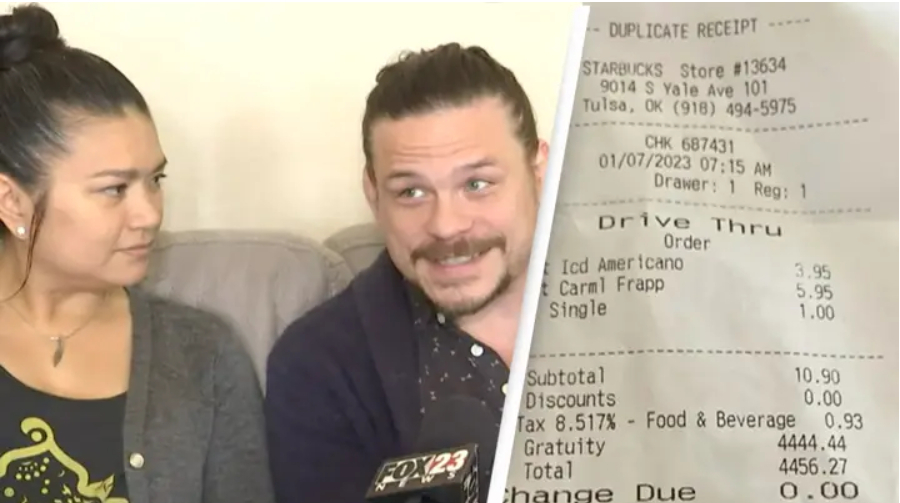 Uden at være klar over det, blev parret opkrævet drikkepenge på $4.444,44 (30.766 dkk) oven i deres almindelige kaffebestilling.