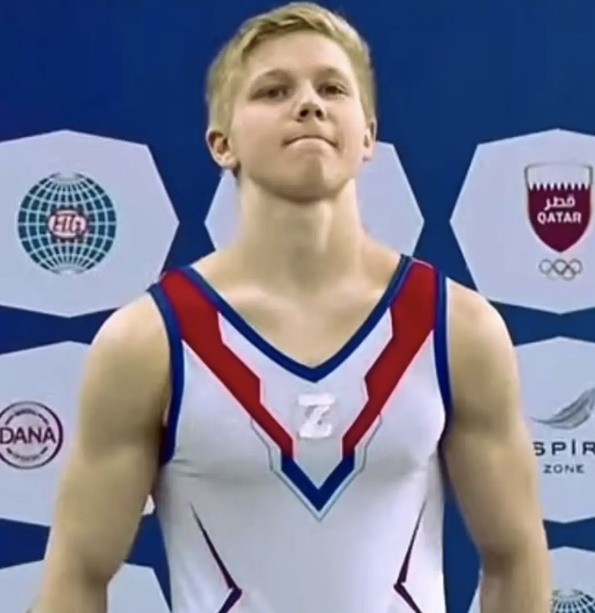 En russisk gymnast har vakt forargelse efter at have båret Z-symbolet, der ses på russisk krigsmateriel i Ukraine, mens han stod på podiet sammen med en ukrainer.