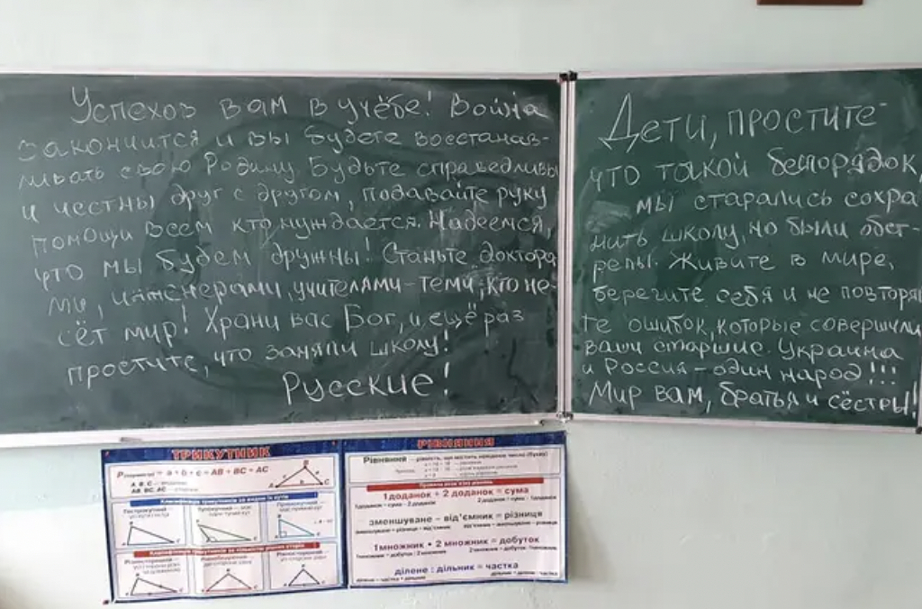 Der er blevet fundet snesevis af lignende beskeder på tavler i skoler, der har været besat af russiske soldater.
