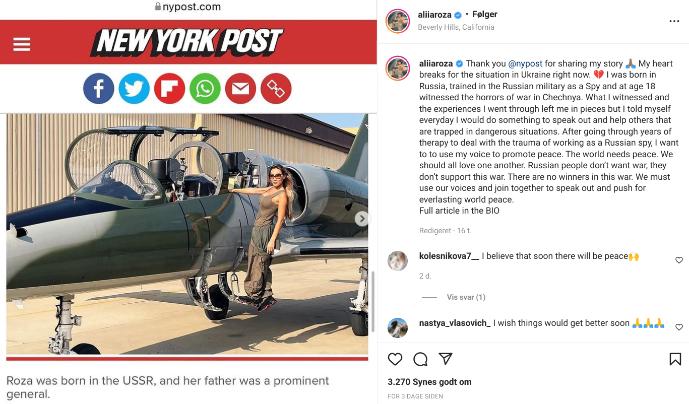 “Efter at have gennemgået årevis af terapi for at håndtere traumaerne, jeg har fået af at arbejde som russisk spion, ønsker jeg at bruge min stemme til at promovere fred. Verden har brug for fred. Vi burde alle elske hinanden,” har hun således skrevet på Instagram (@aliiaroza), hvor hun har mere end én million følgere.