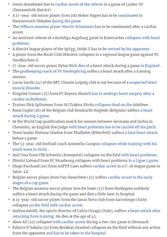 Artiklen indeholder også en liste over et stort antal nylige tilfælde af fodboldspillere, der har haft hjerteproblemer og er kollapset på banen, hvilket i nogle tilfælde har ført til dødsfald.