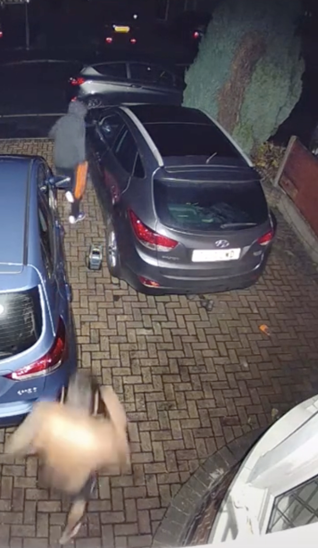 I videoen kan man se en hætteklædt tyv, der har hovedet inde i bagagerummet på en bil, der holder parkeret i Leightons indkørsel.