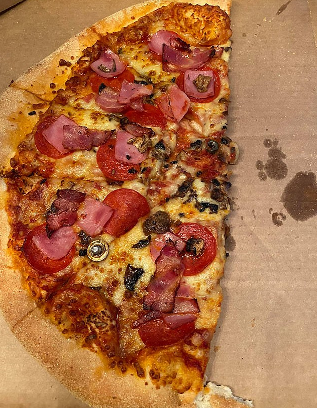Pizzaen, der kom fra en Domino’s-restaurant i den engelske by Thornton-Cleveleys, Lancashire, var nemlig ikke kun pyntet med tomatsauce og skinke, skriver Daily Mail.