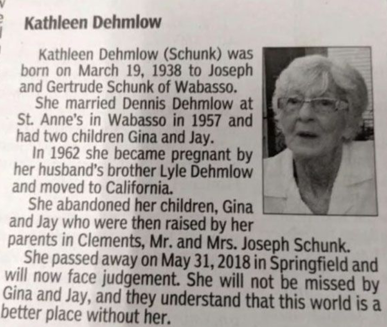 80-årige Kathleen Dehmlow fra USA døde i 2018 og kort tid efter, blev der bragt en nekrolog i den lokale avis, hvor to af hendes børn, Gina og Jay, understregede, at “hun ikke vil blive savnet,” og at “verden er et bedre sted uden hende.”