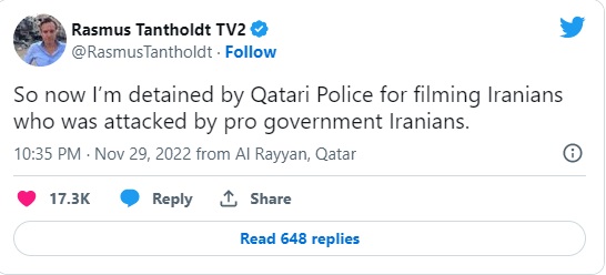 TV 2s korrespondent Rasmus Tantholdt kom i begyndelsen af VM i Qatar i centrum på verdensplan, da han blev standset af Qatars sikkerhedsvagter på direkte tv – og nu er den gal igen.