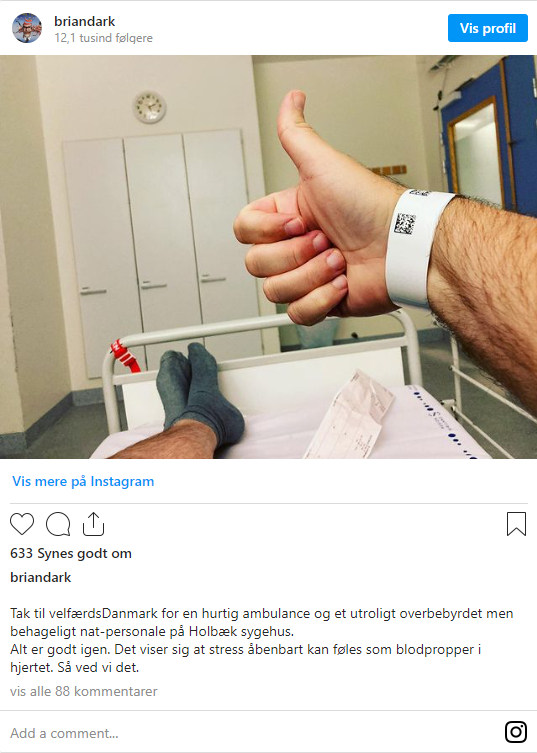 Det viser han på sin Instagram-profil, hvor han har taget et billede fra en hospitalsseng. Til teksten fortæller Brian Mørk sine følgere, at han takker velfærdsDanmark for hurtigt at have hjulpet ham, og samtidig fortæller han også årsagen til, at han blev hastet på hospitalet.