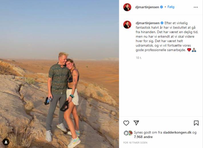 “Efter et virkelig fantastisk halvt år har vi besluttet at gå fra hinanden. Det har været en dejlig tid, men nu har vi erkendt at vi skal videre hver for sig. Det har været helt udramatisk, og vi vil fortsætte vores gode professionelle samarbejde,” lyder det fra Martin Jensen, der har delt et billede af parret sammen.