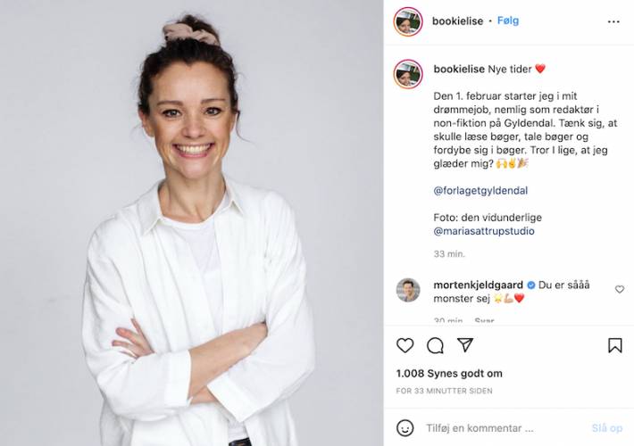 I et opslag på Instagram afslører hun, at hun fra 1. februar næste år starter i et helt nyt job hos Gyldendal. Hun har nemlig fået job som redaktør i non-fiktion, afslører hun.
