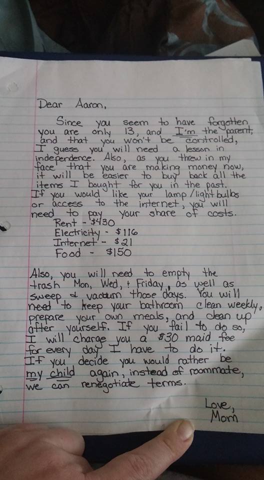 “Siden du har glemt, at du kun er 13 år og jeg er din forælder, så tænker jeg, at du har brug for at lære en lektie omkring selvstændighed. Når du vælter ud med historien om, at du er begyndt at tjene penge, så kan du passende starte med at købe alle de ting tilbage, jeg har betalt for gennem tiden,” skriver hun i brevet, ifølge Kidspot.