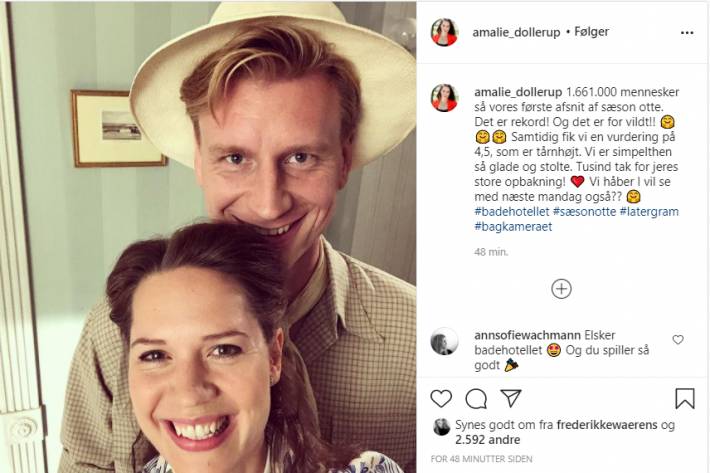 Det første afsnit slog nemlig alle rekorder og havde intet mindre end 1.6 millioner seeere, der sad bænket foran skærmen. Det har medført stor jubel hos blandt andet Amalie Dollerup, som spiller rollen som Amanda. På sin Instagra-profil har hun lagt et billede ud af hende selv og husbonden Andreas Jebro, som også spiller en rolle i denne sæson af den populære serie på TV 2.