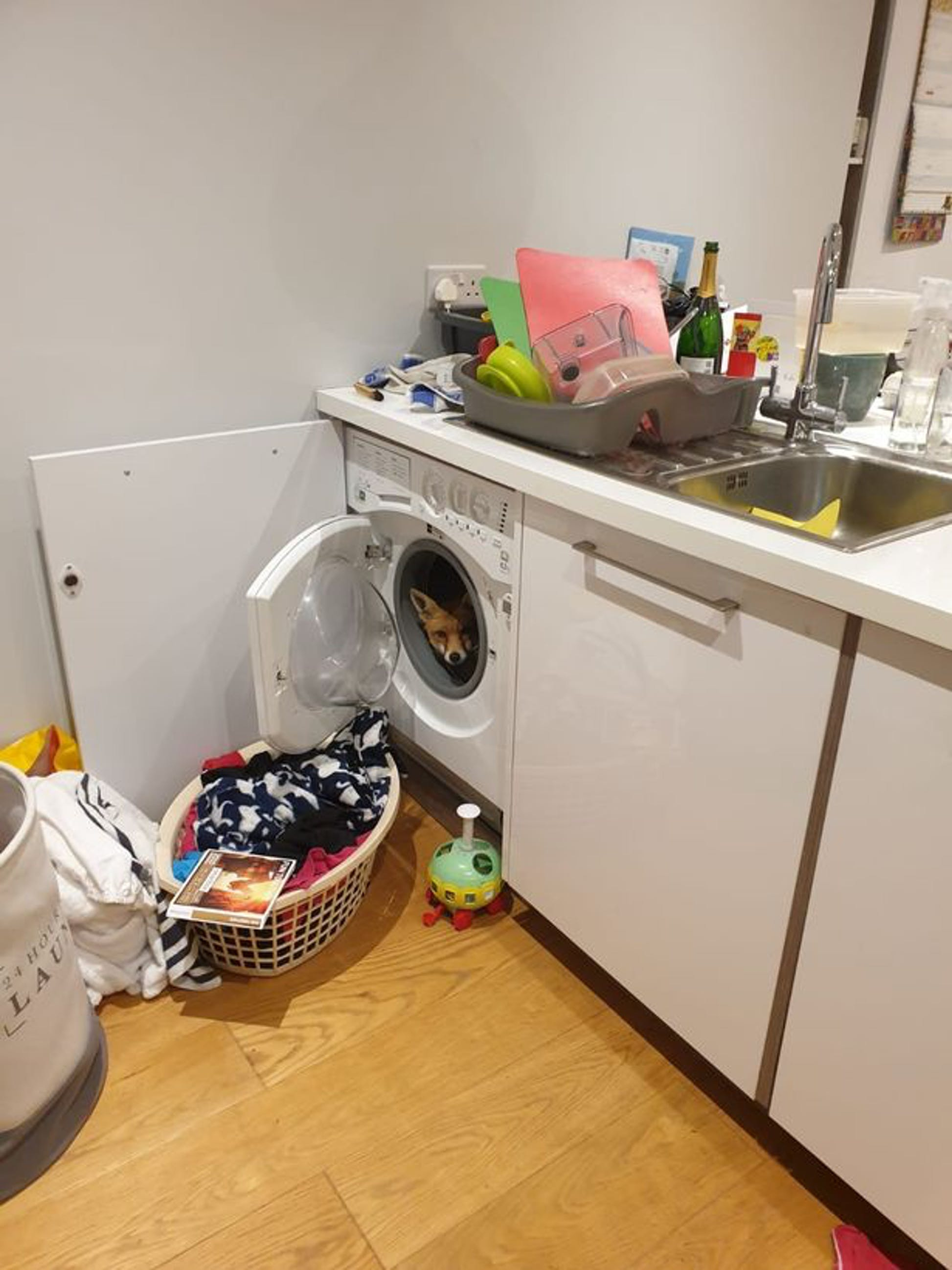 De fik nemlig til sidst øje på et lille, loddent øre, der stak frem inde fra vaskemaskinen, hvor ræven havde fundet sig godt til rette, da det måske kunne minde den om en lille hule, hvor den ikke skulle føle sig truet.