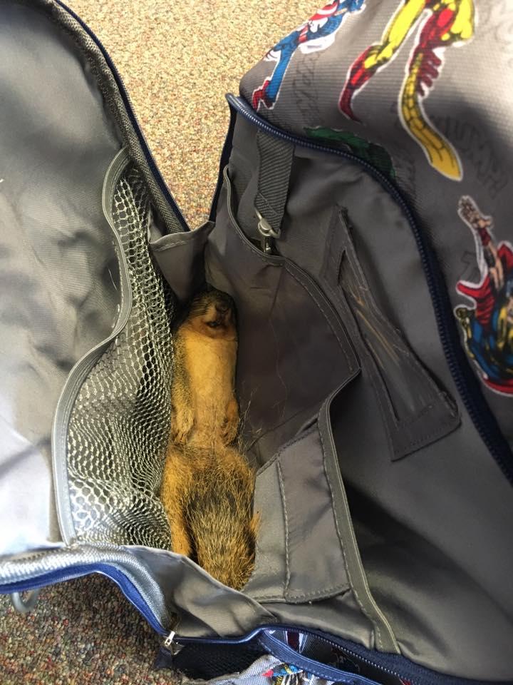 På vej til skole havde hendes otteårige søn nemlig samlet et dødt egern op og stoppet det ned i rygsækken. Da læreren opdagede, hvad drengen slæbte rundt på, spurgte hun, hvorfor i alverden han havde et dødt egern med.
