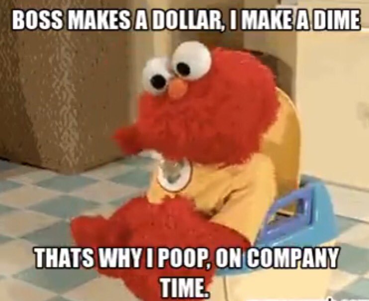 Her uploadede han en såkaldt meme, hvor Elmo fra The Muppet Show sidder på en potte og med teksten ‘Boss makes a dollar, i make a dime, that’s why i poop on company time’