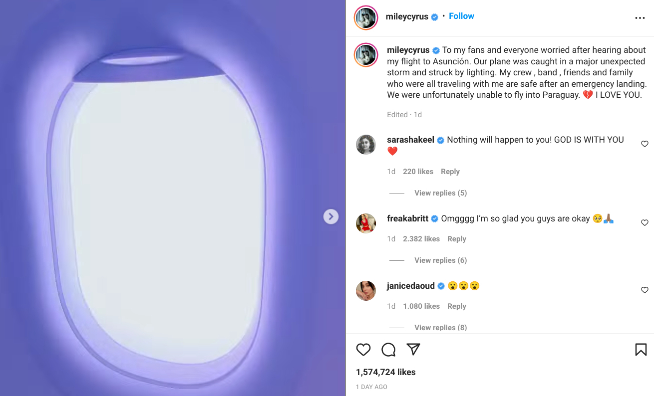 Cyrus var nemlig på vej til det sydamerikanske land Paraguays hovedstad, Asunción i forbindelse med sin Sydamerika-tourne, da flyet, som hun var ombord på, blev ramt af et lyn.